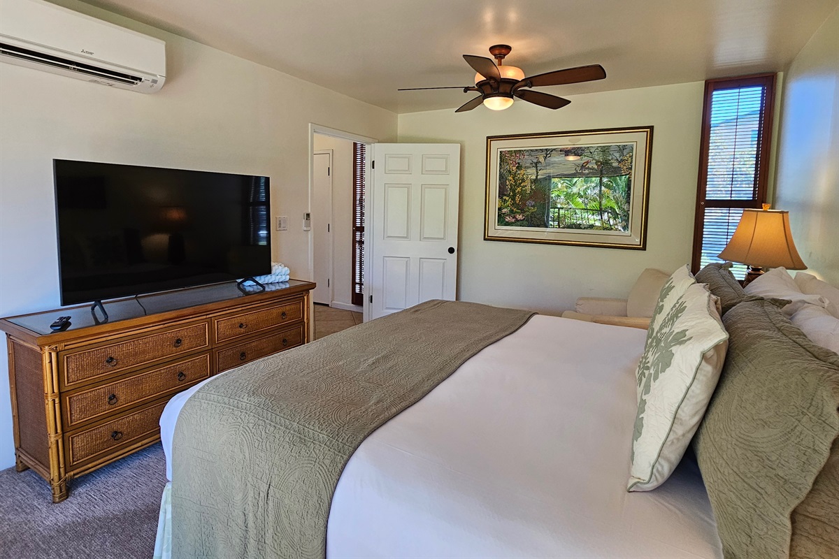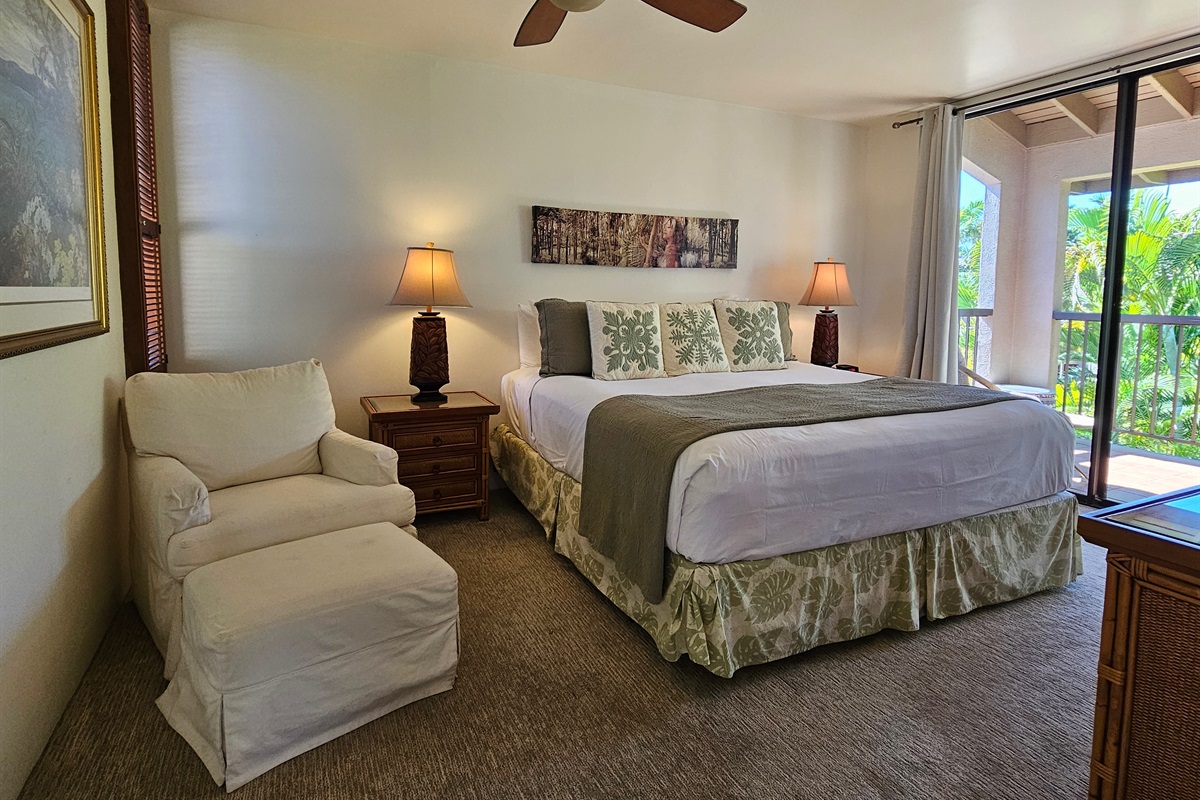The bedroom features a luxurious king-sized bed with a brand new mattress and even features an additional lanai for added outdoor space in this vacation rental.